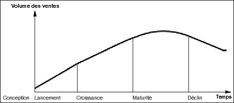 Cette courbe de vie comporte 5 phases essentielles, la conception (mise au point du produit), le lancement, la croissance, la maturité et le déclin ainsi qu'une phase alternative suivant le déclin : La relance éventuelle.