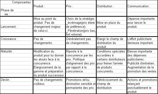 | Voici dans le tableau ci-dessous les différentes opportunités qui s'offrent à l'entreprise pendant le cycle de vie de son produit : |