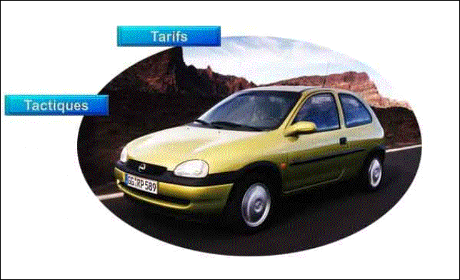 Après l’étude des prix de la gamme CORSA on a pu constater qu’OPEL a décidé utiliser une tactique de pénétration. Effectivement la petite Opel fait la mode d’une part par son allure craquante, mais d’autre part par son prix. En somme Opel pénétre le marché en proposant un prix qui tient les dernières TWINGO, NISANE et FORD K.